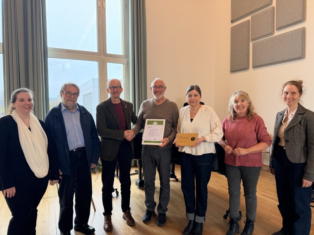 Foto: Das Umweltteam mit Andreas Frei von der oeku. Umweltbeauftragter Hansjörg Schneebeli hält das Zertifikat.